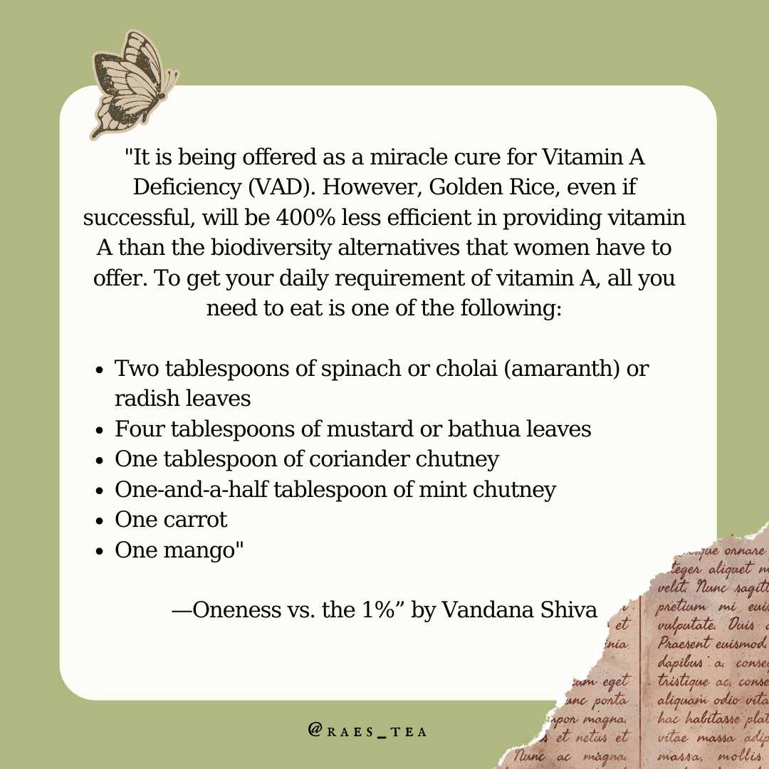 Shiva provides us with an example, GMO Golden Rice, which is a genetically engineered rice with two genes from the daffodil plant and one gene from a bacterium, resulting in a yellow colour that is supposed to increase beta-carotene, a precursor of vitamin A.